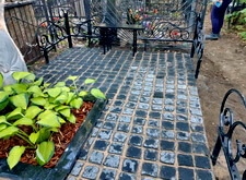 На представленных ниже фотографиях состояние места захоронения на момент прихода клиента. Брусчатка положена, форма цветника и вид оградки изменены. Работа над этим объектом – яркий пример того, как сильно может повлиять на внешний вид участка лишь одно наземное покрытие.
